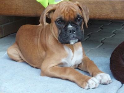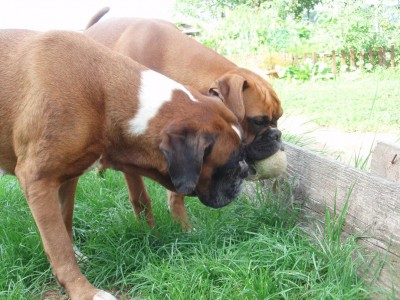 Z Ciry nám roste krásná boxeří slečna, ve svých 7 měsících už má skoro stejnou kohoutkovou výšku jako Terry. Ani se mi nechce věřit, že to bylo nejmenší štěňátko z vrhu. Jsem nadšená z její úžasné povahy, je velice snaživá a za balónek by se přetrhla. Stopy jí taky velmi baví, jenom mi nějakou dobu trvalo přijít na tu správnou a největší motivaci. Takže nakonec se povedlo a k údivu všech stopujeme na kousky banánu :-) (nejlépe pěkně vyzrálého), za ten by Ciruška udělala cokoli. Teprve nedávno jsme začali s kousáním, tak zatím se Cira rozkoukává a přemýšlí, co všechno si na toho pána figuranta může dovolit. Ale zájem má veliký.