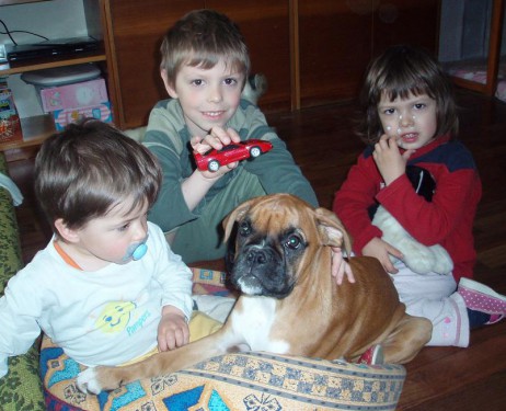 Bydlíme v Kobylnicích u Brna a naše smečka momentálně sestává kromě nás dvou rodičů ještě ze tří dětí a dvou boxeřích holek.